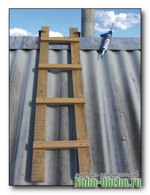 Этим летом мне надо было провести очередную ревизию трубы от печки в месте прохода через крышу бани и в случае, если там образовались щели, заполнить их гермети-ком. Старый длинный трап, который я в своё время специально соорудил для этого, уже не годился, так как была пристроена веранда, и основной скат крыши стал короче, чем мой трап. Лесенка подходящей длины у меня была, но надо было как-то зацепиться за конёк, чтобы надёжно закрепить её на крыше. При этом не хотелось тратить время на сооружение стационарного зацепа. Решение пришло быстро. Я взял две струбцины и привинтил их к лесенке. Получился прекрасный зацеп, который позволил временно закрепить лесенку на коньке.