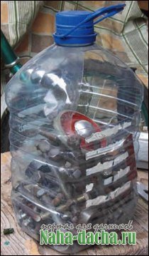 Когда я решил навести хоть какой-то порядок в гараже, мне на глаз попались прозрачные 5-литровые пластиковые бутыли для питьевой воды. Аккуратные, прочные, с прозрачными стенками, через которые прекрасно видно всё содержимое, с удобной ручкой для переноски, а вертикально вытянутая форма ещё и экономит место на полках. Для доступа внутрь острым ножом прорезал в верхней части одной из боковых сторон условно треугольный «вход», через который удобно класть и доставать любые мелкие детали, болты, гайки и тому подобное. А если нужная деталь оказывается на самом дне и рукой до неё не достать, я просто вытряхиваю всё содержимое в старый тазик.