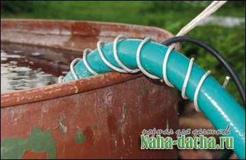 Воду, которая может пригодиться на участке, я обычно заранее наливаю в 200-литровую бочку, а для подачи воды использую насос «Малыш» и шланг. Всё очень просто и удобно, если бы не одно но. Разогретый на солнце шланг на краю бочки перегибается, перекрывая проходное сечение, при этом подача воды практически полностью прекращается. От этой беды удалось довольно легко избавиться с помощью небольшого куска алюминиевой проволоки, которую я навил в виде пружинки на шланг в месте перегиба. Теперь он не переламывается, сохраняя свою круглую форму и первоначальное проходное сечение.