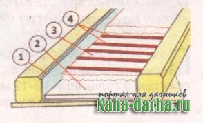 Рис. Схема утепления 1 — гьленка, 2 — пенопласт, 3 — раствор, 4 — бруски