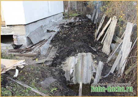 Поверх шин я укладывал полиэтилен или старый рубероид, затем добавлял сверху песок и для жёсткости (шины всё-таки немного пружинят) накрывал обломками старого шифера. Потом сверху опять — песок и землю с торфом. Песок между покрышками и шифером я добавлял для того, чтобы между ними не было пустот, и шифер не ломался. Если края канавы начинали осыпаться, то также вставлял по бокам шифер, который потом не вытаскивал, а оставлял на месте.