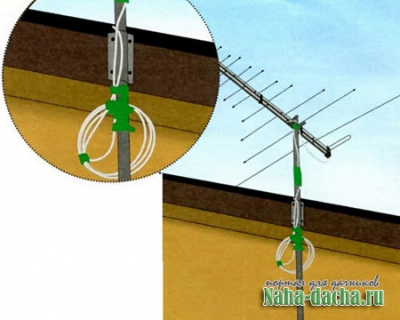 При установке нижний конец «мачты» надевается на вбитый вертикально в карниз домика мощный гвоздь (он фиксирует низ трубы от перемещений по карнизу) и опирается на карниз. В средней части труба крепится к доскам крыши хомутом из кровельного железа и 4 шурупами. Антенна подключается разъемом к кабелю, который идет внутрь домика.