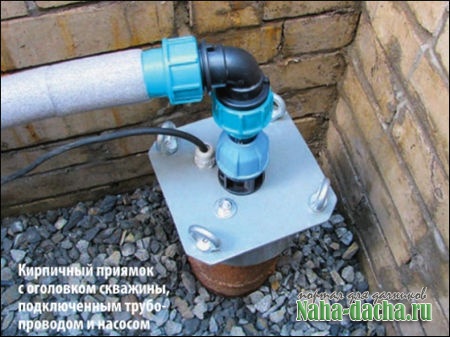 От скважины до домаПри устройстве водоснабжения дома в климатической зоне с зимней минусовой температурой трубопроводы от скважины или колодца до дома прокладывают на глубине ниже уровня промерзания грунта. Порой используется система кабельного обогрева на случай-таки промерзания. Верх скважины можно обустроить разными способами: установкой кессона, адаптера или строительством приямка.