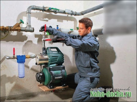 совет специалистаЧтобы правильно выбрать насосную станцию, надо оценить потребление воды и искать оборудование соответствующей производительности. Приблизительный подсчет ведут так: количество кранов-сме-сителей умножают на 500 л/ч (или 0,5 м3/ч). Впрочем, в дилерских центрах ведущих производителей помогут с решением этой задачи.