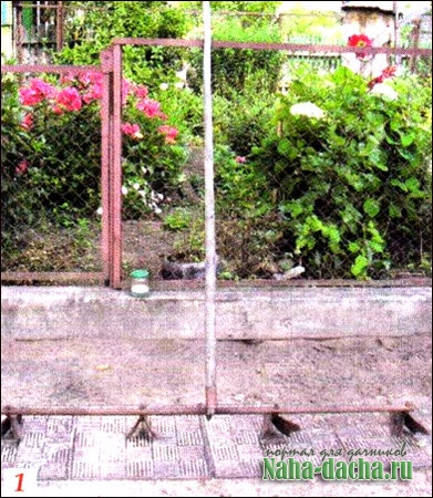 (фото 1). Он состоит из 4 маленьких окучников, прикрученных болтами к горизонтальной металлической штанге d 20 мм. В ней просверлены отверстия, позволяющие переставлять окучники при разной ширине рядков. По центру трубы приварено крепление для шеста-древка длиной 3 м.