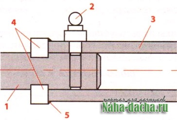 Рис. Узел сцепки1 - дышло-вал к мотоблоку, 2 — масленка, 3 — труба-дышло к прицепу, 4 — разрезанная шайба (из 2-х частей), 5 — места круговой сварки