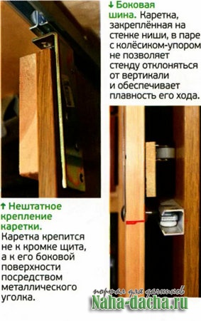 Пришлось изменить типовую конструкцию: вместо направляющей на полу установил на боковой стороне щита ещё один потолочный профиль, который катается по роликам каретки, закреплённой на боковой стороне ниши.