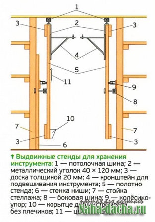 Выдвижные стеныИ выход был найден! Если по бокам ниши поставить выдвижные щиты, то на них вполне можно установить кронштейны - держатели для инструментов и доставать нужные грабли или лопату без проблем.