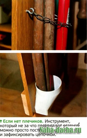 «Узкий» инвентарьЕсть у меня инструменты, которые из-за отсутствия «плечиков» невозможно хранить на деревянных уголках подобно граблям или лопатам. Для их подвески я применяю другой способ: ставлю ручку в корытце внизу щита, а в верхней части цепочкой на крючке фиксирую инструмент. В качестве корытца взял соединительную муфту из ПВХ, которая используется для стыковки круглой вентиляционной трубы с трубой прямоугольного сечения. Прямоугольную часть муфты закрыл обрезком доски, саму муфту закрепил внизу стенда, а повыше повесил цепочку с крючком.