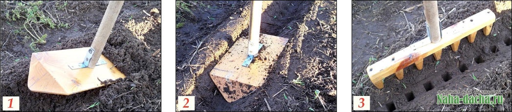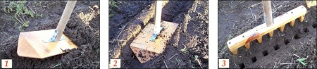 Переворачиваю «Алешу» и легкими ударами маркера пробиваю зубьями лунки для семян (на необходимую глубину) в основании борозды (фото 3). Высеваю семена и, слегка трамбуя вдоль них зубьями, закапываю в землю. Переворачиваю инструмент и трамбую почву бороздником лишь до возникновения характерного хлопка инструмента о землю — важно не переусердствовать!