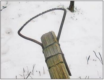 Полольник-рыхлитель согнут из толстой (5 мм) стальной проволоки. Лезвие отклепано и с одной стороны заточено, а с другой сделаны зазубрины. Заточенной стороной сорняки срезаем, а зазубренной вырываем их с корнем. Инструментом этим легко рыхлить землю на грядках. У нас два таких полольника - широкий и узкий. Крепление несъемное (вязальной проволокой), но я делал и съемное (в обрезке старой трубы от пылесоса).