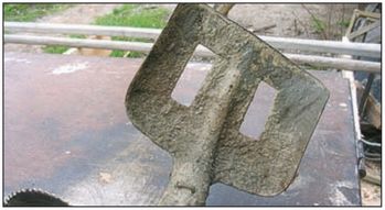 Еще две «строительные» лопаты сделаны из старых лопат с обломившимися лезвиями. Одна используется в основном для замешивания раствора и бетона, хотя годится и для сбора относительно крупного мусора. Тыльная часть черенка внизу обита жестью, чтобы при замешивании раствора черенок меньше повреждался от контакта с бортами растворного ящика.
