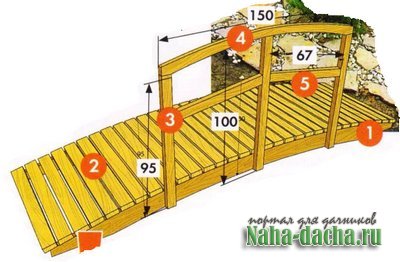 Определяя высоту сооружения, не забудьте о том, что по мостику должно быть удобно и безопасно ходить. Мостик не должен сильно изгибаться, потому максимальный подъем дуги - не более 10 см на метр длины, при этом изгиб не должен превышать 20°.