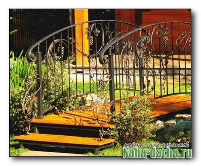Любителям замысловатых конструкций по душе придется ступенчатый мостик - две поднимающиеся навстречу друг другу лесенки с площадкой посередине. При расчете такой конструкции необходимо помнить, что высота ступеньки, умноженная на два, плюс ее ширина в итоге должны быть не более 60 см (ширина шага). Для того чтобы на мостике не задерживалась дождевая вода, ступеньки делают с едва заметным уклоном вниз.