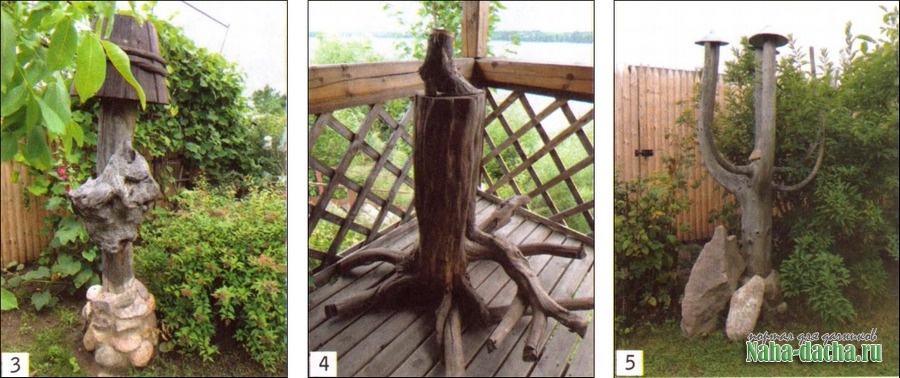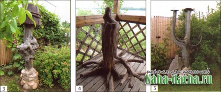 Деревья в саду стареют, высыхают. Что с ними делать? Проще всего, конечно, порубить на дрова для шашлыка, который вкуснее всего получается на углях именно от фруктовых пород. Но если взглянуть на проблему не утилитарно, а творчески, результат может приятно удивить. Оказывается, любое высохшее дерево является отличной заготовкой для оригинальной композиции. При этом одному достаточно приделать каменную ногу (фото 3), другому грамотно подпилить сучья (фото 4), а третьему подобрать подходящий головной убор (фото 5).