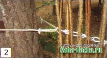 Плетеным забором из сухих веток, конечно, никого не удивишь: и сельчане, и дачники частенько прибегают к этим экономным вариантам. Но, оказывается, такой «тын» можно сделать и подвесным (фото 1). Роль опорных столбов играют стволы, а вместо горизонтальных жердей использован прочный шнур. Деревья от повреждений защищены прокладками, веревка натянута с помощью карабинов (фото 2). Чтобы конструкция не гуляла на ветру, нижние концы веток присыпаны песком. Плюсы такого заборчика очевидны: дешевизна, простота конструкции, а самое главное — мобильность. Ведь его можно не только быстро «поставить», но также оперативно снять и перенести на другое место.