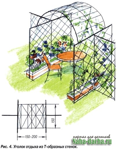 (рис. 4). Сверху к этим стенкам приваривается арка, сделанная из трубок. Внизу установлены пластмассовые или деревянные ящики с растениями, стебли которых обвивают сетку стенок и арки.
