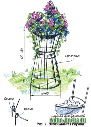 рис. 1 представлена вертикальная клумба высотой 120-150 см. К верхнему раструбу металлической корзины прикреплена чаша, в которой растут вьющиеся растения. Проволочный «сноп» корзины собран из алюминиевых трубок, которые в центре, внизу и вверху скреплены кольцами, придающими клумбе конструктивную жёсткость и устойчивость. Соединение колец с вертикальными трубками осуществляется при помощи специальных пластмассовых или металлических защёлок.