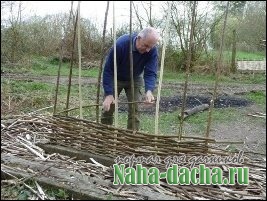 Перед тем как приступить к работе, колья я очистил от коры, а прутья замочил в воде на несколько часов (а вообще лучше всего использовать их сразу после срезки).