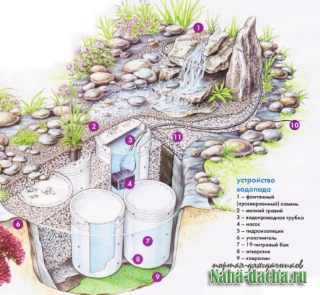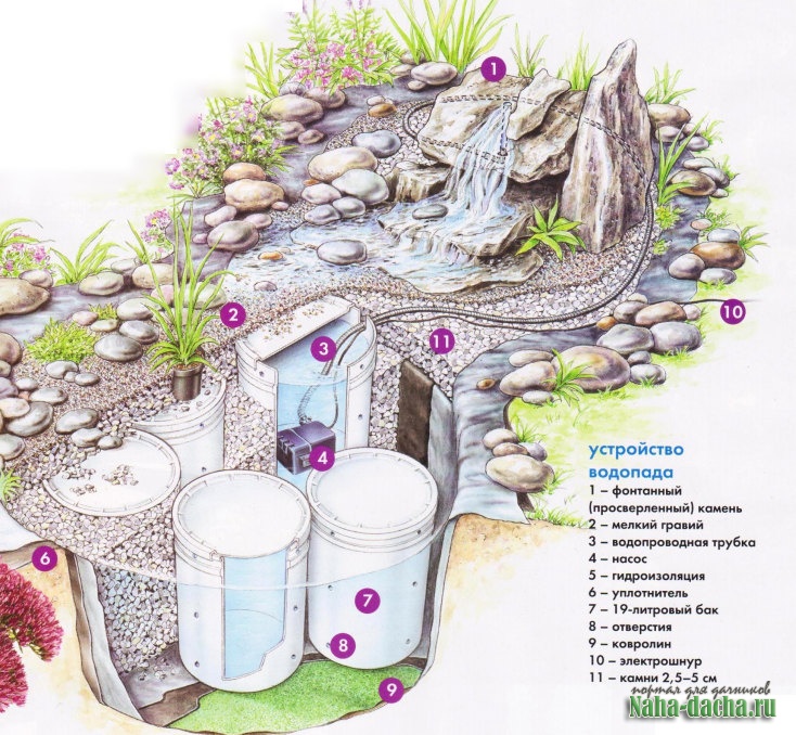 есть идея!Процесс создания этого водопада на самом деле проще, чем может показаться на первый взгляд. Не нужно ни особых навыков, ни специальных сложных инструментов. Правда, есть действительно тяжелая часть работы: придется копать яму размером 2,4 х 3 м и глубиной приблизительно 0,6 м, и таскать гравий. Для сооружения большого водопада понадобятся насос, гравий, гидроизоляция для водоема и уплотнитель, декоративные камни, в том числе просверленный. Но вы можете сделать что-то поменьше и попроще. Создание небольшого водопадика, конечно, обойдется дешевле. В результате вашего труда в саду появится чудесное живописное место.