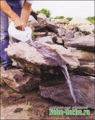 в поисках камняМожет быть, посчастливится найти подходящий камень самостоятельно, в ближайших окрестностях. Если нет - стоит посетить строительно-садовые магазины или обратиться в компании, торгующие камнем. В некоторых из них вам помогут просверлить выбранный камень, в других есть камни с готовыми отверстиями. Выбор фонтанного камня - нелегкая задача. Возьмите с собой несколько пластиковых бутылок с водой, чтобы иметь возможность полить на разные камни и посмотреть, как стекает с них вода. Если вы хотите, чтобы ваш водопад выглядел как естественный родник, то подбирайте камень с желобками или канавками. Если вам хочется, чтобы вода выливалась булькая и пузырясь, ищите камень- с -естественным углублением. В любом случае, камень должен быть не более 38 см толщиной в том месте, где он будет просверлен, - более крупный нельзя будет просверлить. Обычный камень, без отверстия, можно просверлить самостоятельно.