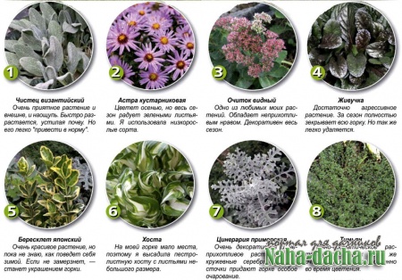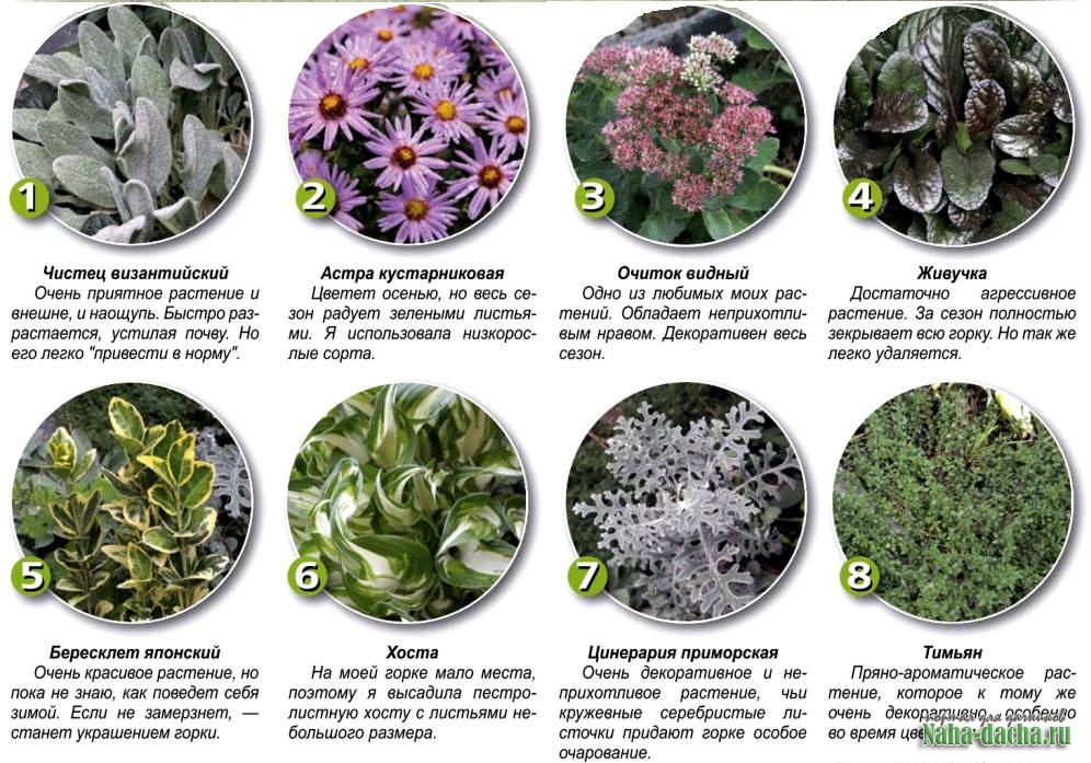 Мне хотелось, чтобы горка радовала глаз в течение всего сезона, поэтому выбирала те растения, которые сохраняют декоративность на разных фазах вегетации. Идеальный вариант — растения, которые, меняя свой облик, остаются такими же красивыми. Например, очиток видный. Он хорош ранней весной, когда из почек только прорастают листочки-розочки, все лето его куст-куртина украшает цветник, а осенью розовые шапки соцветий привлекают не только взоры цветоводов, но и многочисленных бабочек. Для украшения своей горки я использовала многолетние растения, чтобы из года в год композиция оставалась неизменной. Хотя, особенно в первые годы, пустоты между растениями можно заполнить летниками.