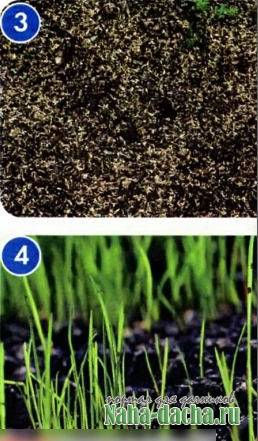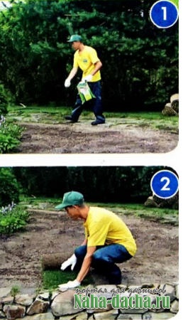З. Сеем-веем. Участок засевают сначала в продольном, а затем в поперечном направлении,чтобы травостой был густым и равномерным. Удобно навести граблями небольшие бороздки, а семена для равномерности смешать с песком. После посадки участок полить.