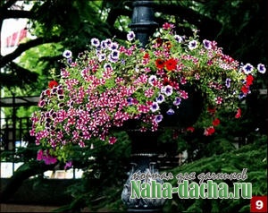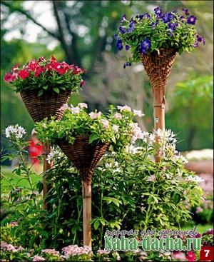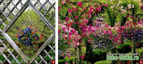 (5). Это позволяет добиться максимального эффекта при экономии места: подвесные корзины хорошо видны издалека. Очень удачно сочетание корзин с петунией и кустарников или роз на арках