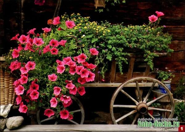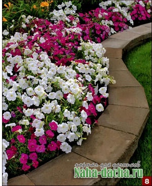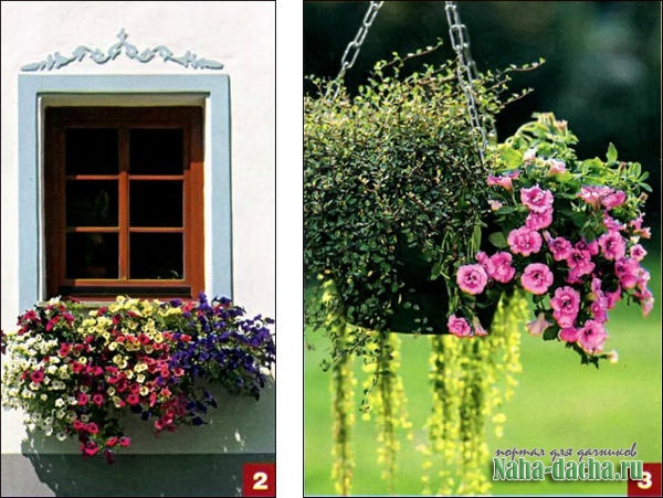 (6). Мощные растения защищают петунию от ветра, а она в свою очередь удлиняет период декоративности композиции за счет непрерывного цветения. В небольшом саду трудно найти место, чтобы разместить большую клумбу, а маленький цветник может зрительно теряться рядом с фасадом дома или крупным кустарником. Чтобы довести его до нужного объема, используйте корзины или контейнеры с цветами, приподнятые над основной плоскостью