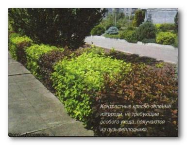 Декоративнолистные изгородиТакие изгороди подразделяют на однотонные (например, бордовые - из пузыреплодника сорта Diabolo, яркожелтые -из пузыреплодника Darts Gold) и разноцветные, причем можно смешивать растения с листвой контрастной окраски либо с оттенками одного цвета, мягко сочетающимися друг с другом. Очень эффектно смотрятся двух- и трехъярусные разноцветные изгороди, когда окрас листвы меняется от яруса к ярусу.