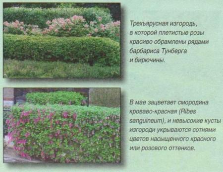 Однако на большом пространстве, а также в саду, не перегруженном другими посадками. однопородные изгороди могут показаться монотонными, скучными, поэтому в этом случае желательно оформить комбинированные изгороди из нескольких пород. В таких посадках одни растения могут привлекать декоративными цветами, другие - плодами, третьи - выделяться цветом листвы, четвертые - зимней окраской коры. Тогда изгородь будет интересно выглядеть в любое время года. Обязательно следует помнить, что живые изгороди из двух пород можно создавать, только высаживая каждую породу отдельным рядом.