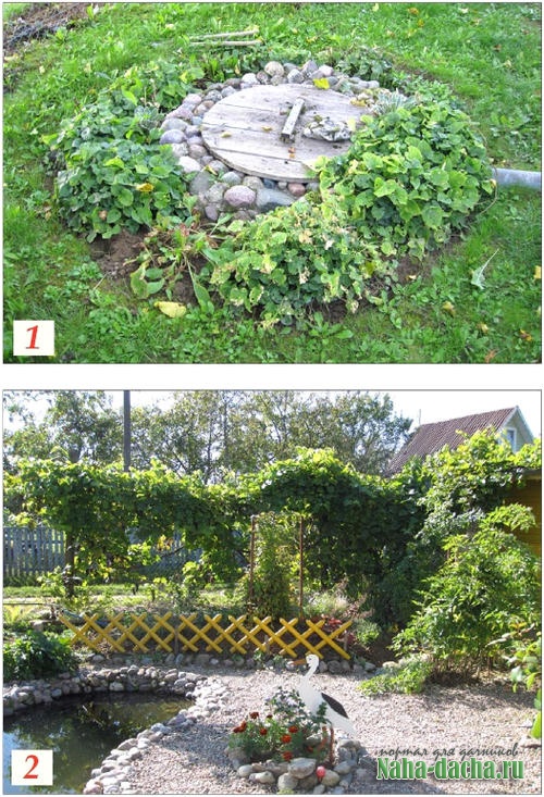 Также трудолюбивая чета обложила камнями оголовок канализационного колодца — смотрится красиво (фото 1). А виноградник и цветочную клумбу декорировали заборчиком из деревянных штакетин-карандашей (фото 2).