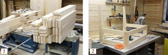 Из досок толщиной 25 мм и бруса сечением 120x40 мм нарезал необходимое количество деталей нужного размера и формы. Для соединения деталей использовал способ шип-паз. На фрезерном станке по дереву обработал детали для каркаса скамеек, вырезав нужное количество пазов и шипов для них (фото 1).
