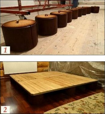 В сарае хранились обрезки цилиндрованного бруса. Нарезал их на заготовки длиной 20 см (всего 9 шт). Обработал торцы и боковую поверхность колодок шлифмашинкой (можно наждачкой) и покрасил водостойкой краской по дереву в тон пола в комнате. Получилось 9 массивных ножек для будущей кровати (фото 1). К одному из торцов каждой ножки приклеил накладки из ковролина, чтобы они не царапали паркет.