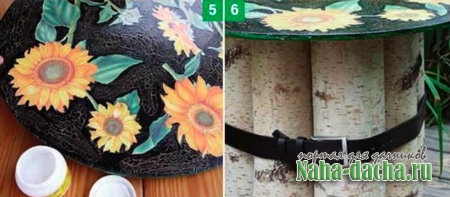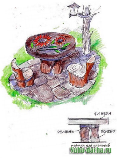 Конечно сегодня выбор садовой мебели настолько велик что глаза просто разбегаются! Но согласитесь вещь, сделанная своими руками, неповторима, как и атмосфера вашего сада. Поэтому давайте засучим рукава и соорудим вот такой чудесный столик для летних чаепитий. Мотивом декора этого симпатичного объекта стали подсолнухи — эти солнечные и жизнерадостные цветы как нельзя лучше отражают радостную атмосферу летнего сада. Посмотрите, какая оригинальная вещица, ведь изножье нашего столика сделано из... березовых поленьев. И что немаловажно» процесс его создания окажется необременительным для кошелька, ведь дрова и остатки фанеры в дачном хозяйстве всегда найдутся.