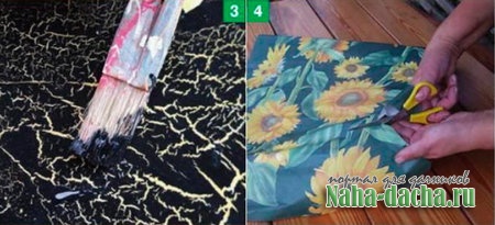 3. На одну сторону столешницы кистью или губкой нанесите средство для получения кракелюров. Хорошо просушите поверхность в течение 4 часов, затем быстро нанесите поверх черную краску (поверхность прямо на глазах начнет покрываться золотыми трещинами) и оставьте на 4 часа подсыхать.