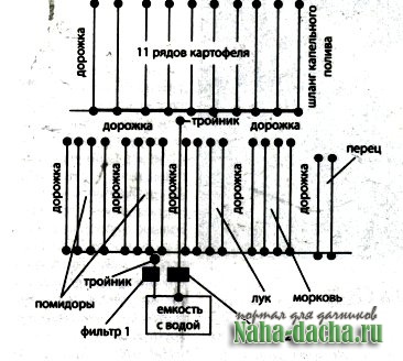 Да, чуть не забыла. Мы сделали отдельно систему полива картофеля от остальных культур из-за того, что картофель поливается намного реже, чем перец, морковь, лук и помидоры. (Но, конечно, все зависит от формы и площади огорода.)