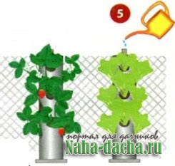5. Высадите в отвер-стия-окошки растения: клубнику, салат, пряные травы. Воду для полива и жидкие удобрения заливайте в открытый конец узкой трубы, они будут равномерно пропитывать почву. Такие грядки-трубы можно выставить в ряд вдоль забора и при необходимости утеплять или затенять пленкой.
