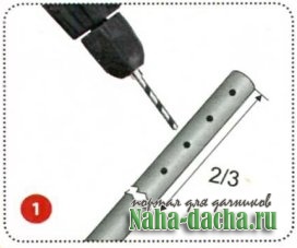 ИЗГОТОВЛЕНИЕ:1. Обрезаем широкую трубу на желаемую высоту грядки. Высота на полторы головы ниже вашего роста будет оптимальной для ухода за растениями. Узкую трубу обрежьте на 7-10 см длиннее. Просверлите дрелью 3 параллельных по длине ряда отверстий в узкой трубе на 2/3 ее длины.