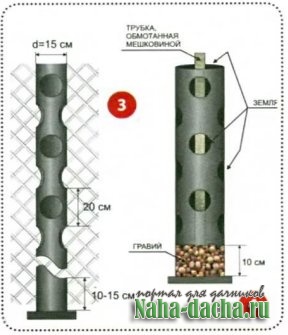 4. Вставьте узкую трубу в центр широкой, низ полости на 10 см засыпьте гравием, остальное пространство плотно заполните садовой почвой.
