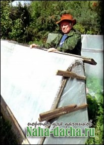 Две стороны треугольной теплицы закрываю армированной пленкой. С северной стороны креплю планку снизу к каркасу по периметру. С южной стороны пленка крепится снизу к каркасу, сверху - к доске шириной 10-15 см и длиной на 20 см больше длины грядки (сбоку пленка не крепится). Таким образом, южная сторона теплицы закрывается пленкой, при этом пленка разматывается снизу вверх и укладывается на конек конструкции, так что доска несколько свисает на северную сторону, обеспечивая натяжение пленки на южной стороне и ее прилегание к боковым планкам теплицы.