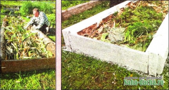 4. Чтобы борты не гнили, их не точили насекомые и просто в эстетических целях, белю их или крашу (краской на водной основе для фасадов). Затем укладываю ботву (но не многолетние сорняки!): моркови, картофеля и томатов, листья капусты. Проливаю настоем коровяка или травяным настоем. Сверху сыплю слой огородной земли в 8-10 см.
