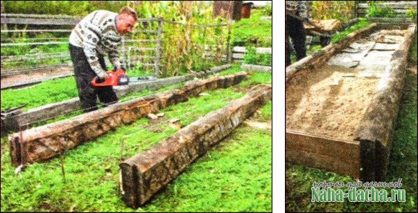 1. Осенью после уборки урожая подготавливаю ровную площадку. Прочно укладываю бревна-борты (можно немного заглубить в землю) и между собой скрепляю гвоздями или шурупами. Длина грядки произвольная, а ширина зависит от климатических особенностей: чем жарче, тем она шире. Я делаю узкие гряды шириной 80-120 см.