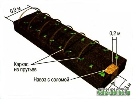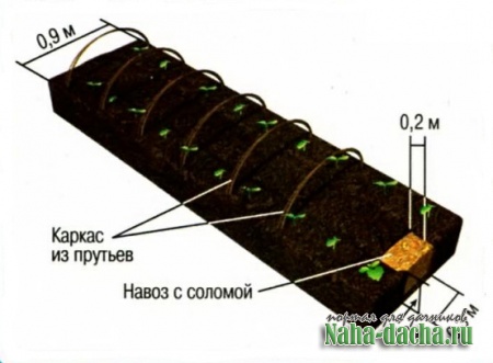 В апреле, как тол ько сходит снег, я сооружаю грядку 0,9 м в ширину. По ее центру по всей длине прокапываю канаву 0,3 м шириной и глубиной. Засыпаю в нее навоз (конский или коровий), перемешанный с соломой. Поливаю его горячей водой и присыпаю землей слоем до 0,2 м. Высаживаю на грядку рассаду с двух сторон от канавы, устанавливаю каркас из ивовых прутьев и накрываю его пленкой. Тепла, выделяемого навозом, вполне хватает для создания в парнике благоприятной для роста огурцов температуры. В теплые дни их даже приходится открывать, чтобы не сгорели.