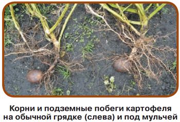 При такой подготовке всходы обычно появляются дружно и практически одновременно. Когда ростки достигают в высоту 5-7 см, полностью засыпаю их компостом, сеном и поливаю ЭМ-раствором (по весеннему варианту). Это защищает побеги от возвратных холодов и ускоряет созревание почвы. Кроме того, под мульчей почва всегда влажная, и поливать картофель не нужно.