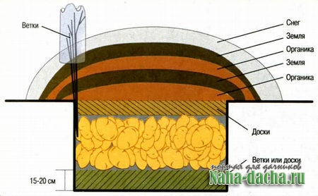 Я укрываю бурты слоями по 15-25 см в такой последовательности: органика (сено, солома, опавшая листва) - земля - органика -земля - снег. Причем первые 2 слоя укладываю осенью, когда засыпаю в ямы урожай. Покрываю их сверху пленкой от дождя. А остальные слои укладываю в начале зимы, когда устанавливаются морозы. Пленку при этом убираю. Весной тающий снег с буртов сбрасываю.