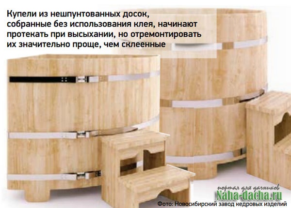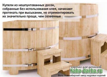 Выбираем купель из дереваСегодня чаще используют прямые шпунтованные рейки, которые стягивают регулируемыми обручами из нержавеющей стали. При этом соединения «шип-паз» проклеивают водостойким столярным клеем, а днище сажают на сантехнический герметик. Такой способ изготовления обеспечивает герметичность купели, однако владелец должен следить за тем, чтобы в летнюю жару она не оставалась надолго без воды. В противном случае есть вероятность, что клёпки растрескаются; ликвидировать подобные «аварии» путём регулировки хомутов-обручей, как правило, не удаётся.