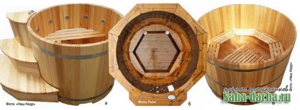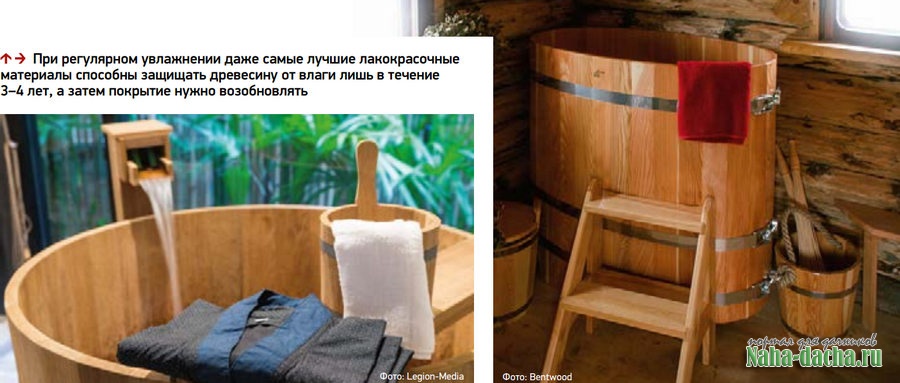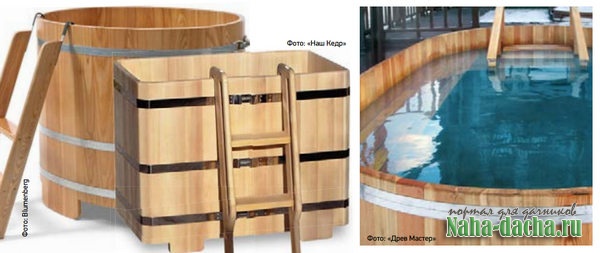 Если говорить о породах дерева, то лучше остановить выбор на лиственнице, дубе либо алтайском кедре. Смолистая лиственница устойчива к гниению и сохраняет прочность в течение десятилетий. Дуб набухает сильнее и со временем приобретает характерный тёмно-серый цвет, но остаётся крепким (нередко дубовые клёпки «живут» дольше стальных обручей). Кедр несколько менее стоек к поражению грибком, но зато испускает чудесный хвойный аромат и насыщает воду полезными эфирными маслами.