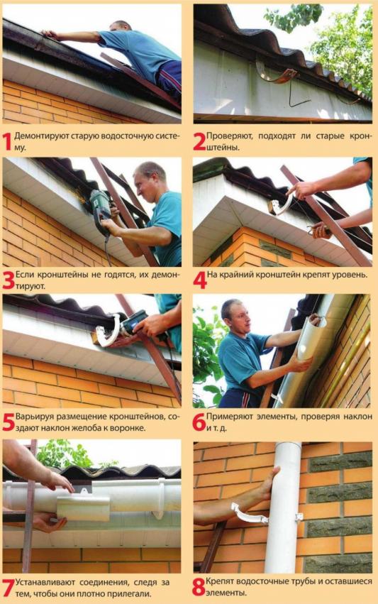 Кроме того, перед заменой осмотрите старые кронштейны. Возможно, они пригодятся и выдержат новую водосточную систему. Если же их надо менять, то при установке между новыми желательно соблюсти расстояние не более 60 см (если производитель не рекомендует другое).