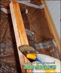 Пока подсыхает морилка, засверливаем очень тонкие отверстия d 0,9-1 мм в штапиках. Это поможет избежать их растрескивания при забивании гвоздей.